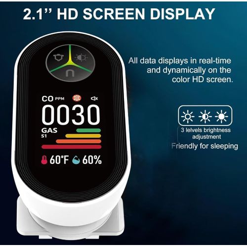 【HD Screen】 All the data will real times show on the HD screen, we can read the data faster from the big icons like: CO ppm, combustible gas indicating bar, humidity, temperature, CO indicator icon, and alarm status. Also we can judge the brightness status from brightness icon.