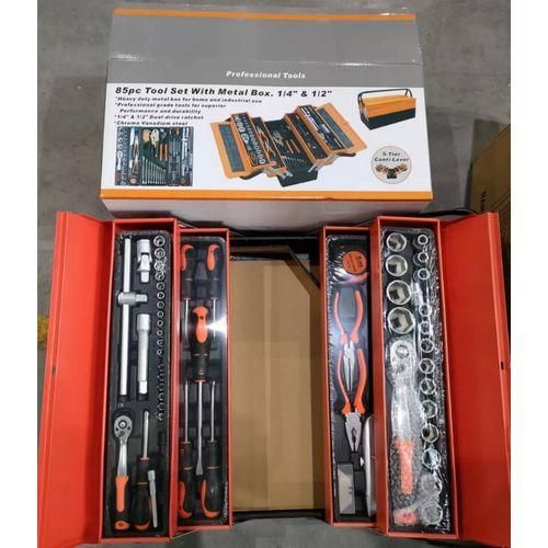 85pc tool set with metal box is used for mechanical work tools box with a lot of content inside such as plier cutter spanner gripping plier screwdrivers etc