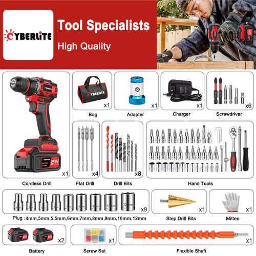 The new CYBERLITE brushless cordless impact drill is perfect for drilling tasks across wood, concrete, metal, plastic, and glass. It effortlessly tightens and loosens screws, making it ideal for woodworking, patio projects, garage work, DIY tasks, and professional use. With its powerful performance and versatility, the CYBERLITE drill is an essential tool for both hobbyists and professionals alike.