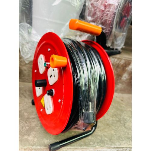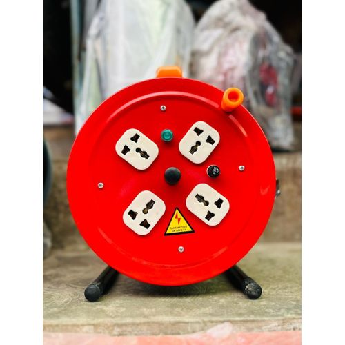 A durable and portable extension cable reel featuring 4 universal multi-socket outlets, suitable for different plug types. It includes an overload protection switch, a strong reel casing, and sturdy supporting legs for stability. Ideal for home, office, workshops, construction sites, or outdoor use. Designed to safely power multiple devices, tools, and appliances at once.