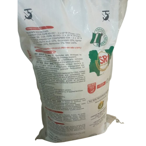 SR1 Gold Bio NPK 12:11:12 Fertilizer | 50 kg is a biologically-enriched organic fertilizer offering balanced nutrition and beneficial microbes native to Nigerian soils. It enhances soil health, plant vigor, yield, and product quality suitable for all major crops. Users appreciate its eco-friendly profile and easy integration into sustainable farming practices .
